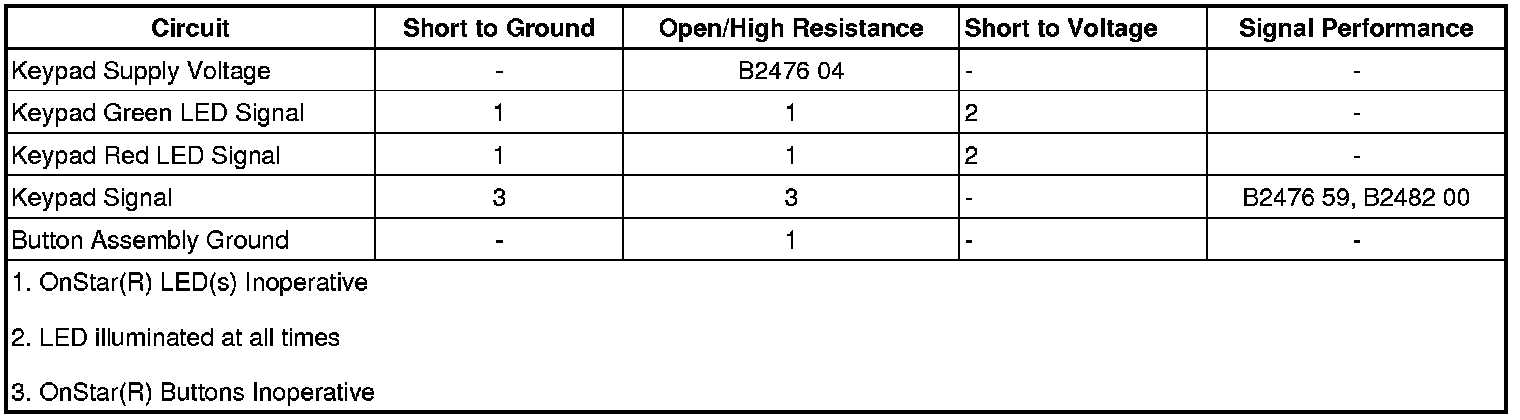 The OnStar(R) button assembly consists of 3 buttons, Call/Answer, OnStar(R) Call Center, and OnStar(R) Emergency. The communication interface module (CIM) supplies the OnStar(R) button assembly with 10 V via the keypad supply voltage circuit. Each of the buttons, when pressed, completes the circuit across a resistor allowing a specific voltage to be returned to the CIM over the keypad signal circuit. Depending upon the voltage range returned, the CIM is able to identify which button has been activated.