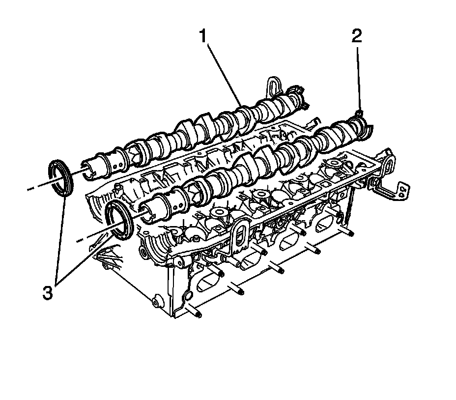 4. Remove the camshafts (1, 2) and oil seal rings (3).