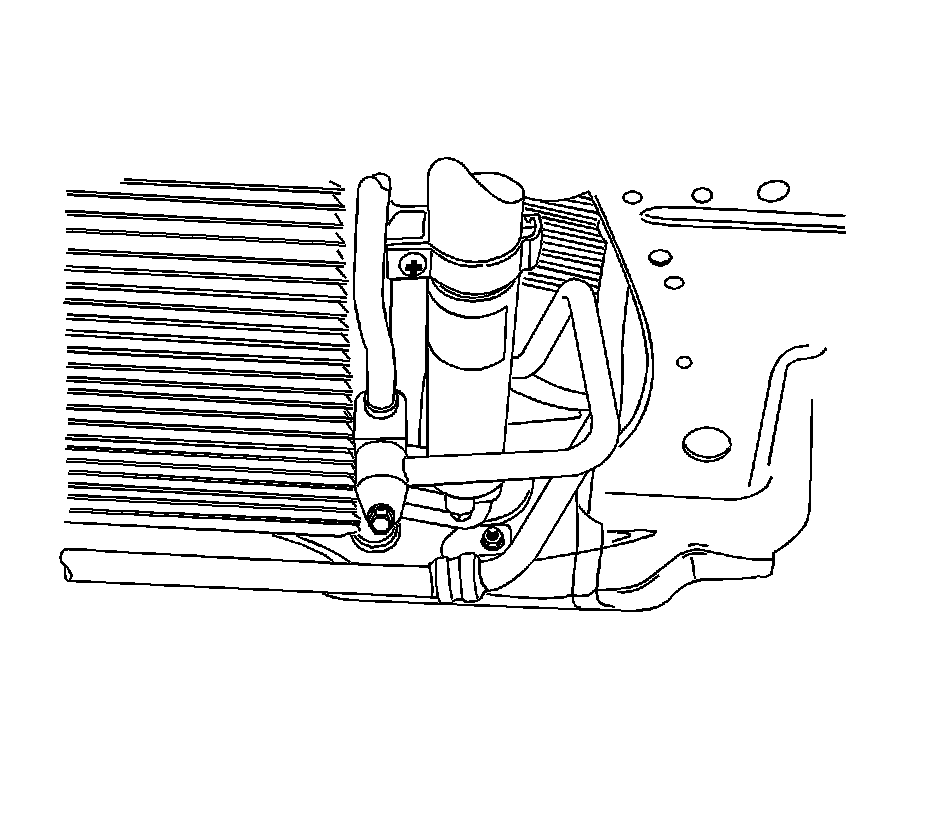 11. Remove the refrigerant discharge hose connector block bolt at the condenser.