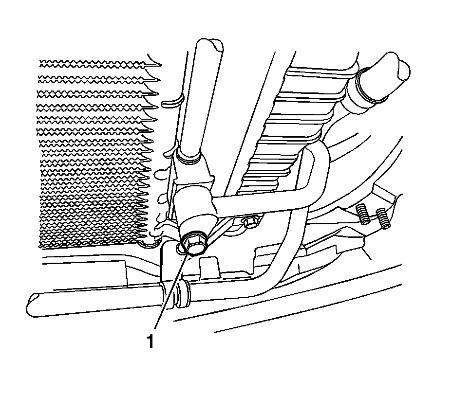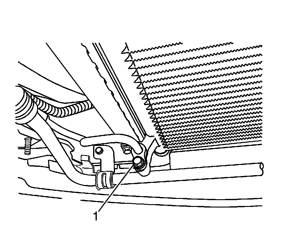 11. Remove the refrigerant discharge hose connector block bolt (1) at the condenser.
