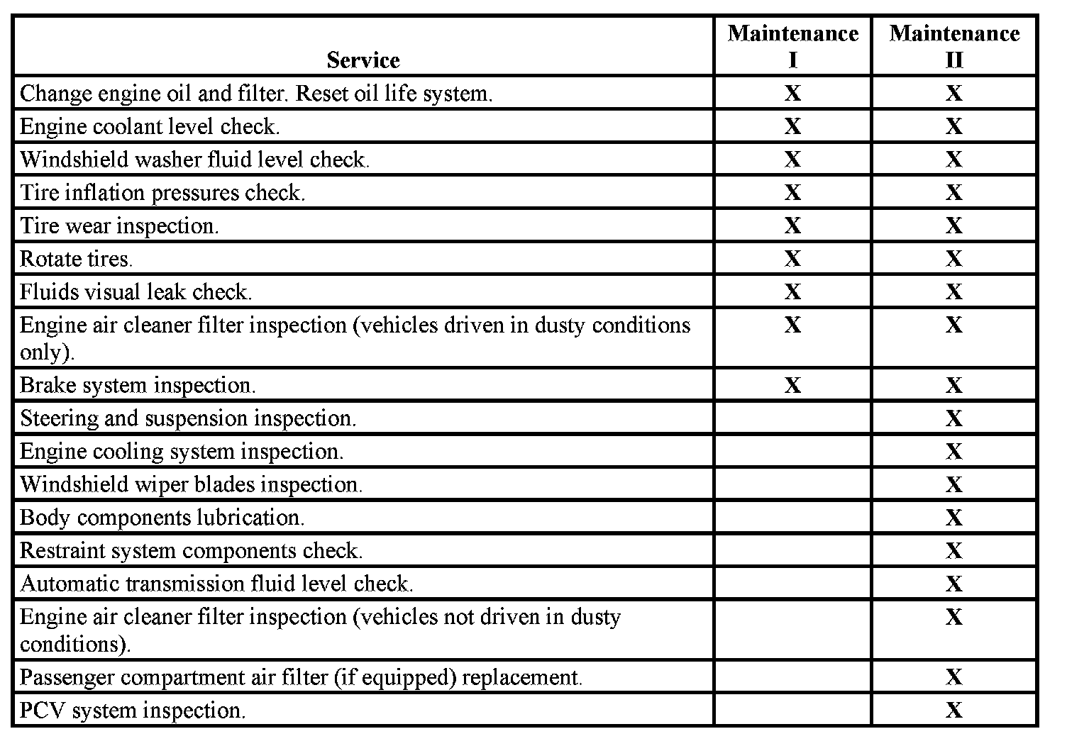 When the change engine oil light displays, certain services, checks, and inspections are required. The services described for Maintenance I should be performed at every engine oil change. The services described for Maintenance II should be performed when: