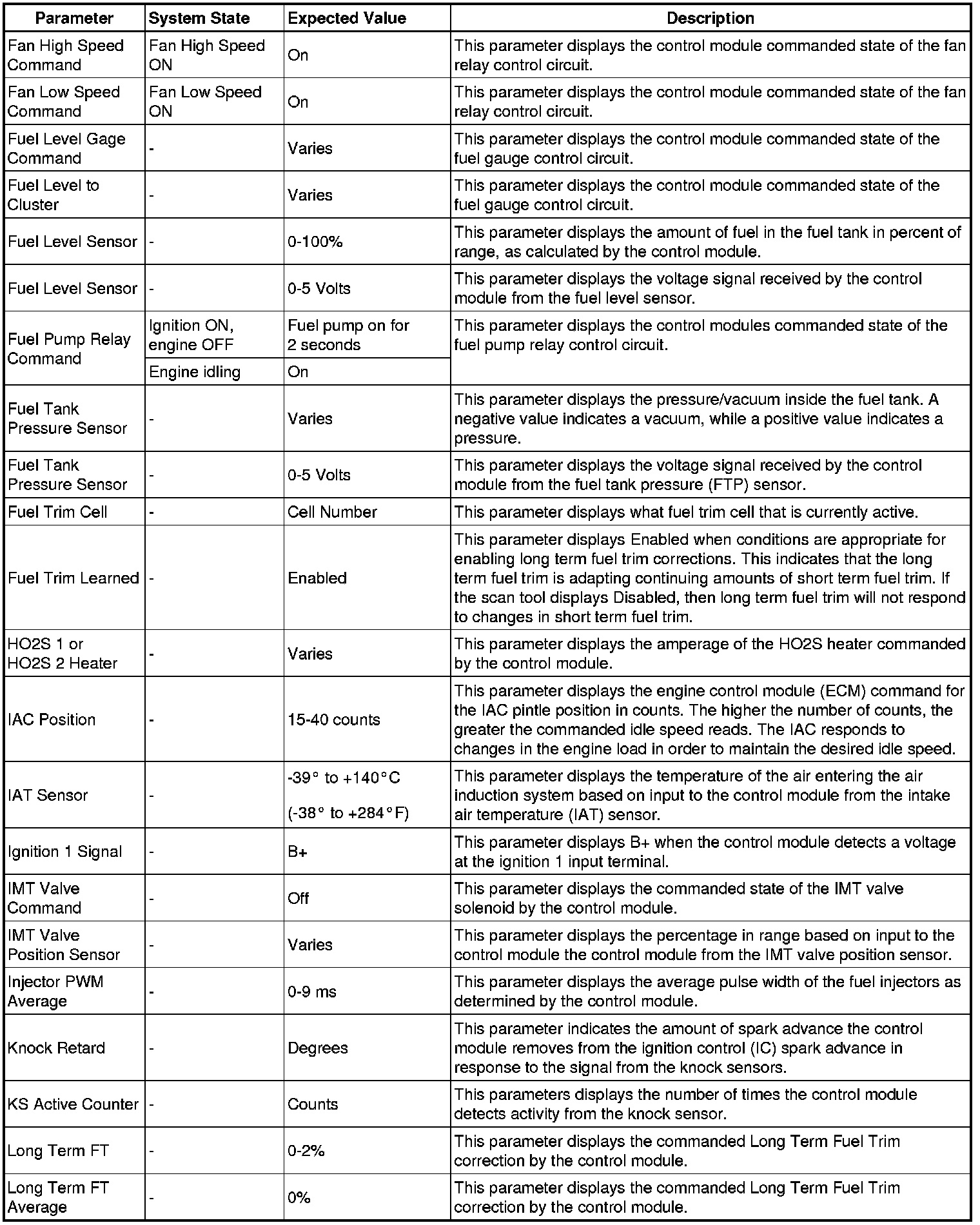 The scan tool values from a properly running engine may be used for comparison with the engine you are diagnosing. The Engine Scan Tool Data List represents values that would be seen on a normally running engine.