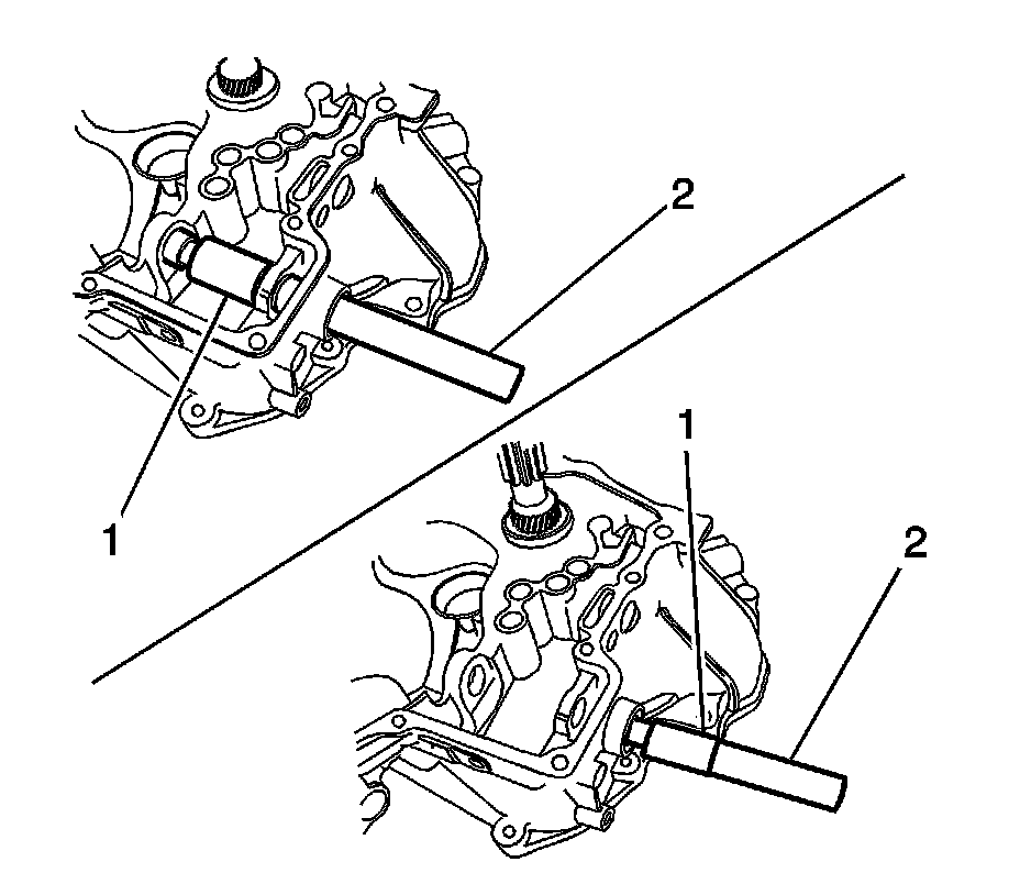 16. Install the shift and select shaft needle bearing using DT 47516 (1) with DT 47515 (2).