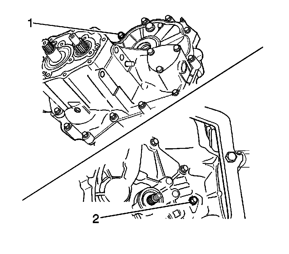 28. Install the transaxle left side case to the transaxle right side case bolts (1) and tighten to 19 Nm (14 lb ft).