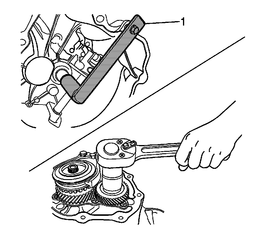 7. Install the differential assembly (1) to the right side of the transaxle case. Position the differential ring gear surface lower than the right side of the transaxle case surface.