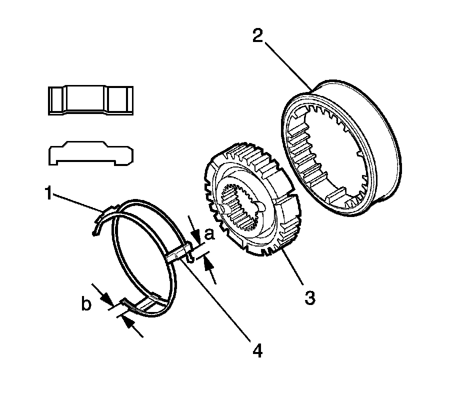 Note: When assembling the synchronizer sleeve and hub, ensure distance (a) equals distance (b).