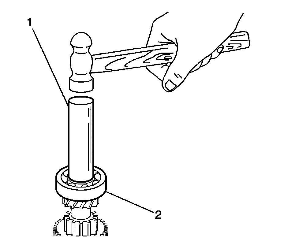 12. Install the 5th gear spacer (2) using DT 46495 (1) and a hammer.