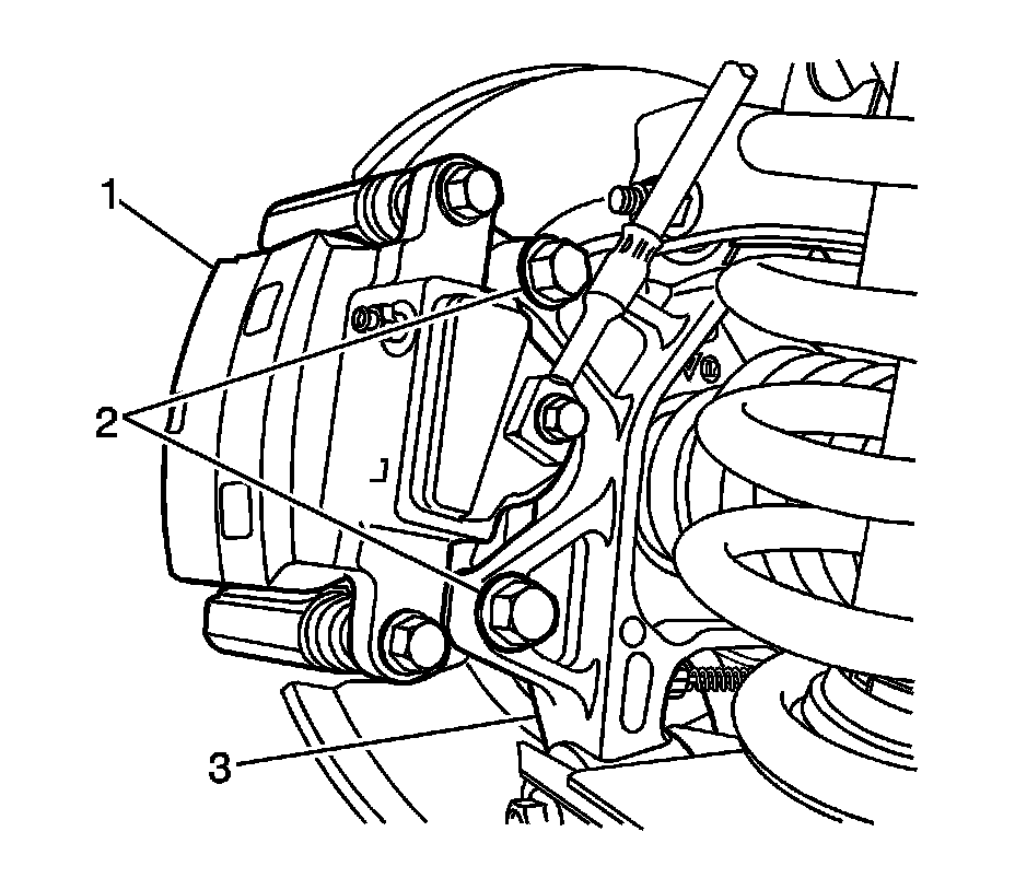 9.Remove the brake caliper anchor plate to knuckle retaining bolts (2).