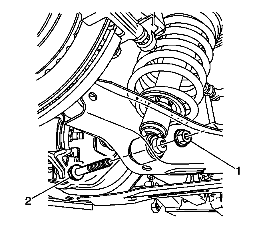 21.Remove the rear strut assembly to lower control arm retaining bolt (2) and nut (1).