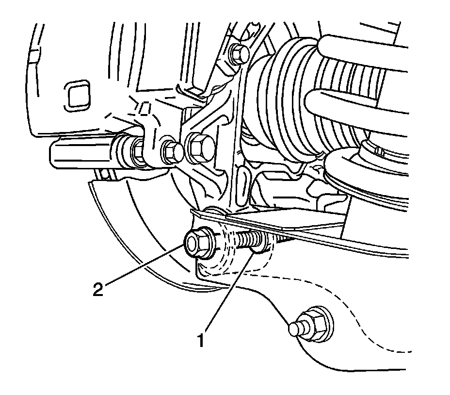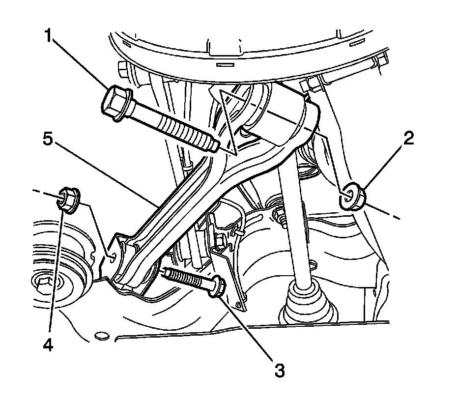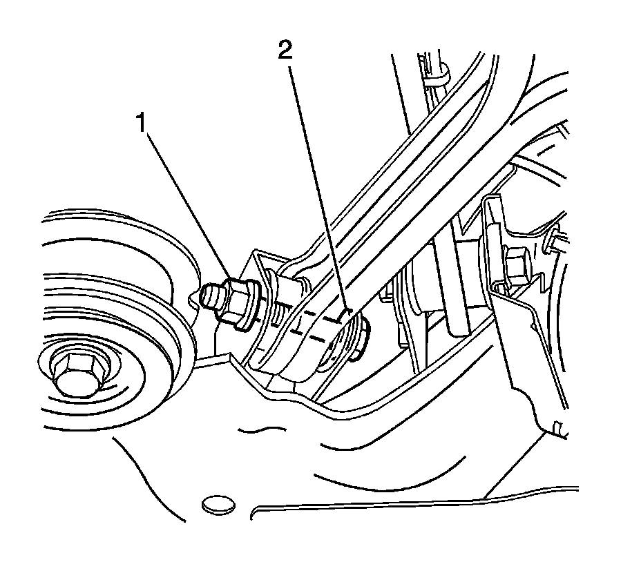 Note:The lower control arm to subframe retaining bolt (1) and nut (2) eccentric washers (3) that are used to adjust the rear suspension camber. One eccentric washer (3) is mounted directly to the head of the lower control arm to subframe retaining bolt (1).