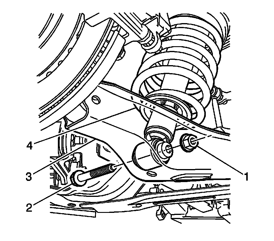 Note:The lower control arm to the subframe retaining bolt (1) and nut (2) eccentric washers (3) are used to adjust rear suspension camber.