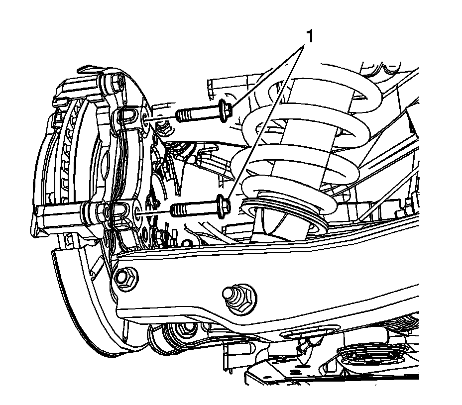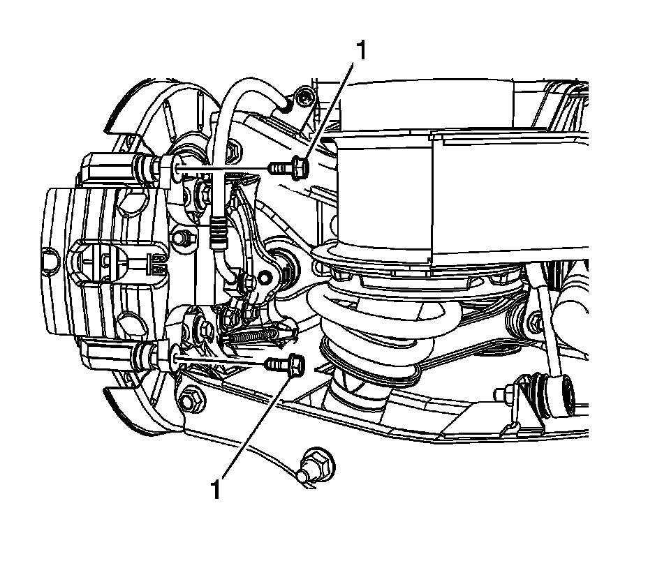 8. Remove and discard the disc brake caliper bracket bolts (1).