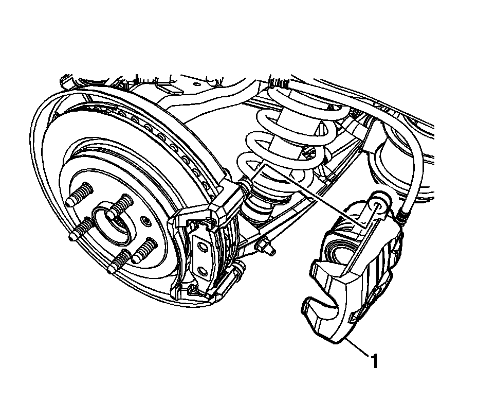 Caution: Support the brake caliper with heavy mechanic wire, or equivalent, whenever it is separated from its mount and the hydraulic flexible brake hose is still connected. Failure to support the caliper in this manner will cause the flexible brake hose to bear the weight of the caliper, which may cause damage to the brake hose and in turn may cause a brake fluid leak.