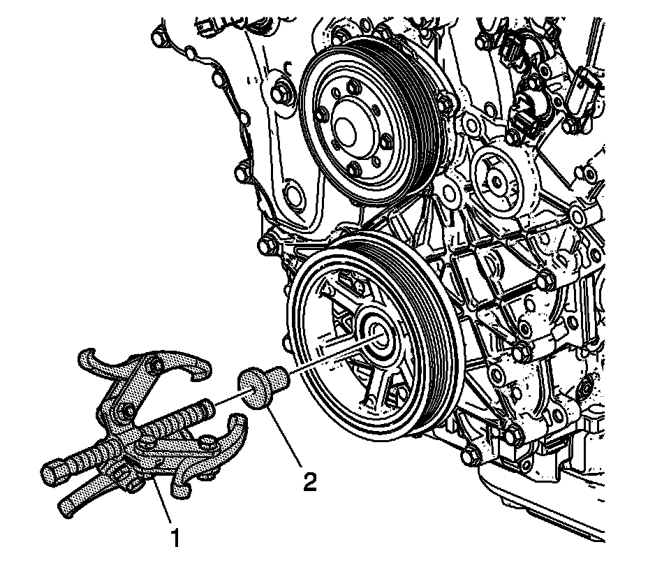 4. Install the J 38416-B - remover (1) in order to remove the crankshaft balancer.