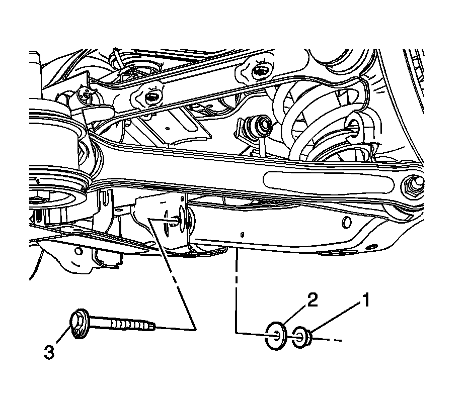 8. Remove the rear lower control arm adjuster bolt (3), washer (2), and the nut (1).