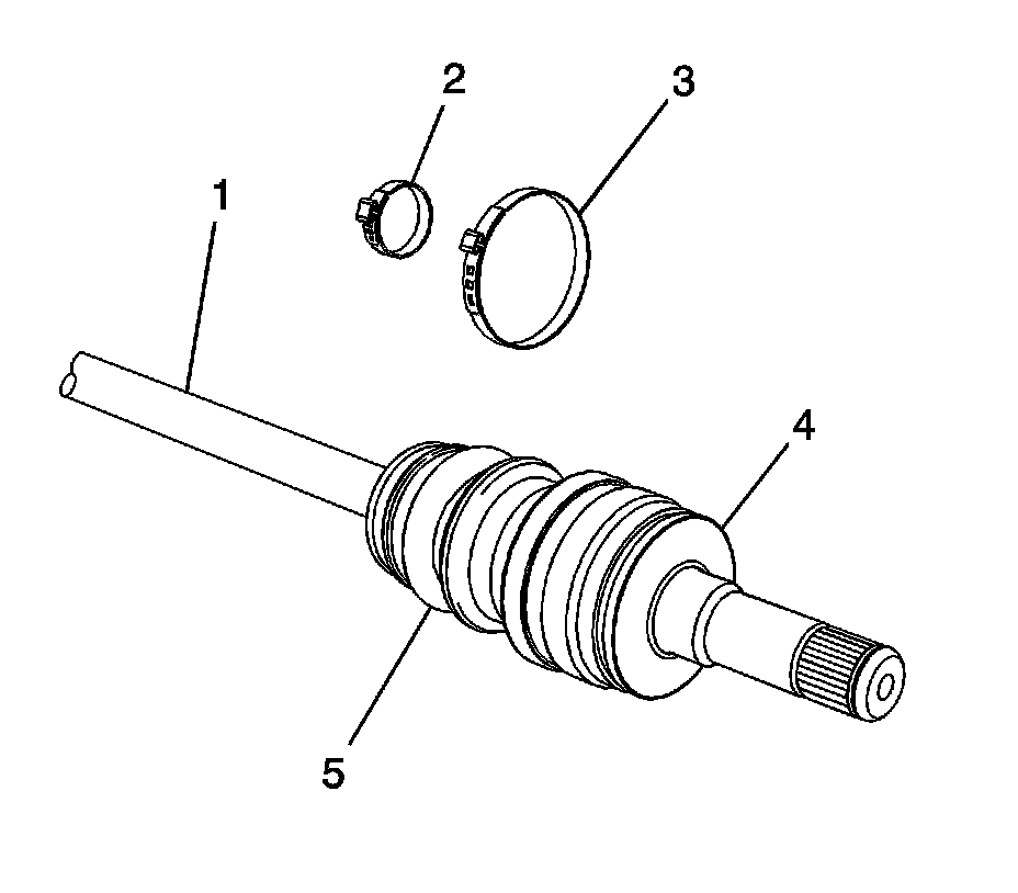 3. Using the appropriate tool, remove and discard the outer boot clamp (3) and the inner boot clamp (2) from the CV joint (4).