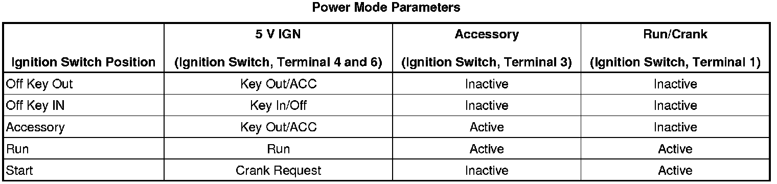 With a scan tool, access Power Mode data display list and compare all parameters listed with the corresponding ignition key position. The Power Mode Parameters table below illustrates the correct state of these input parameters in correspondence to the S39 ignition switch position. The circuits which the individual parameters are related to are in parentheses.
