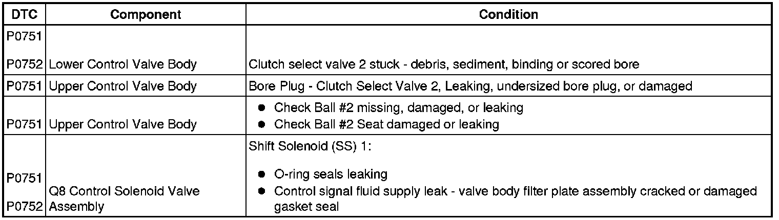 4. Listed in the chart below are conditions for each component that could set DTC P0751 or P0752. Carefully inspect each component for that condition. Repair or replace as necessary.