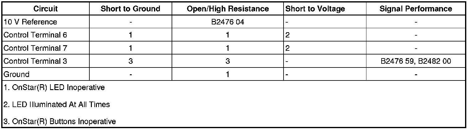 The OnStar(R) status LEDs are located with the OnStar buttons. The green LED is illuminated when the system is ON and operating normally. When the green LED is green and flashing, it is an indication that a call is in progress. When the red LED is illuminated, a system malfunction is present. In the event there is a system malfunction and the OnStar(R) system is still able to make a call, the LED will flash red during the call. The OnStar(R) LEDs are controlled by the communication interface module (CIM) via the keypad green LED signal circuit and the keypad red LED signal circuit.
