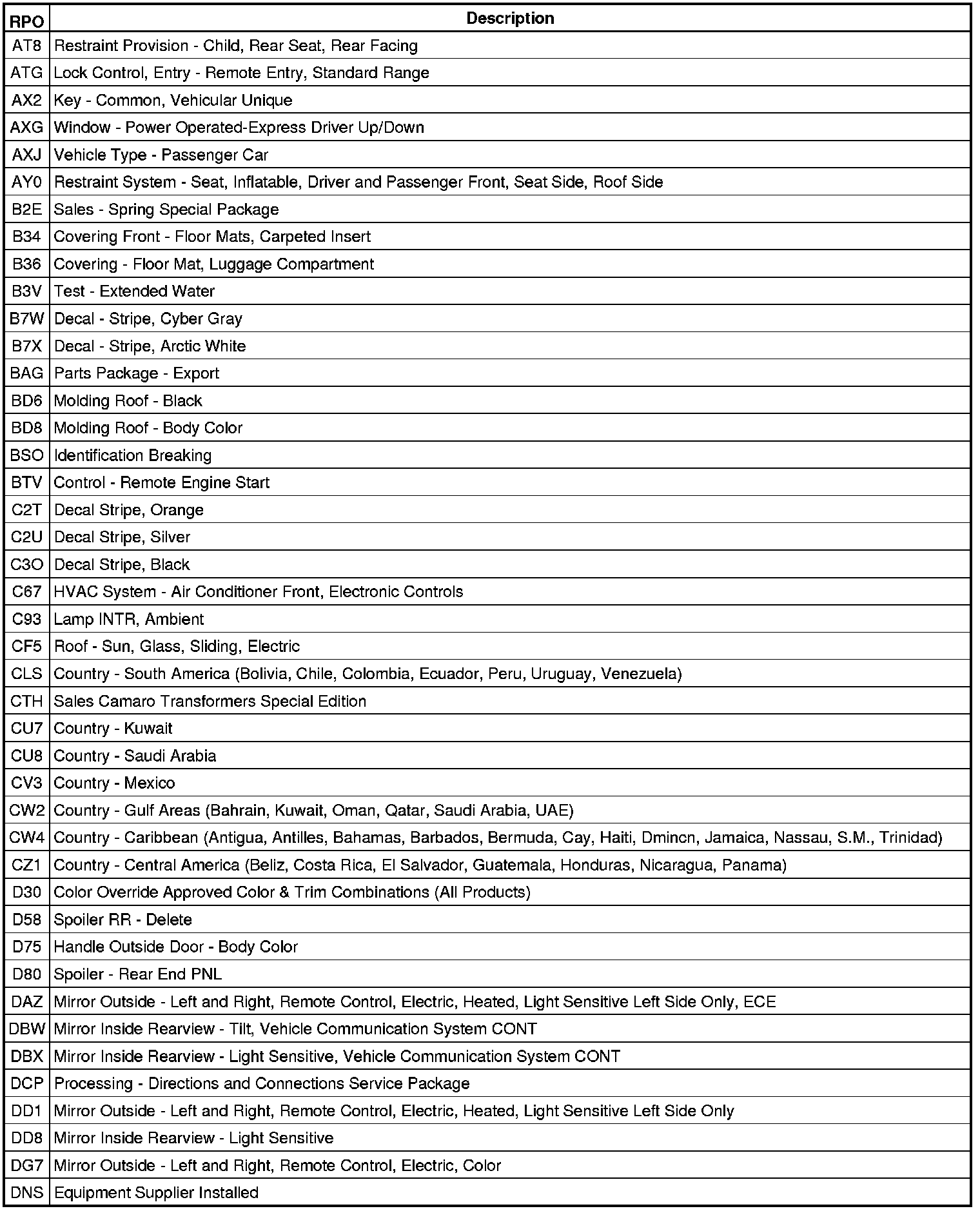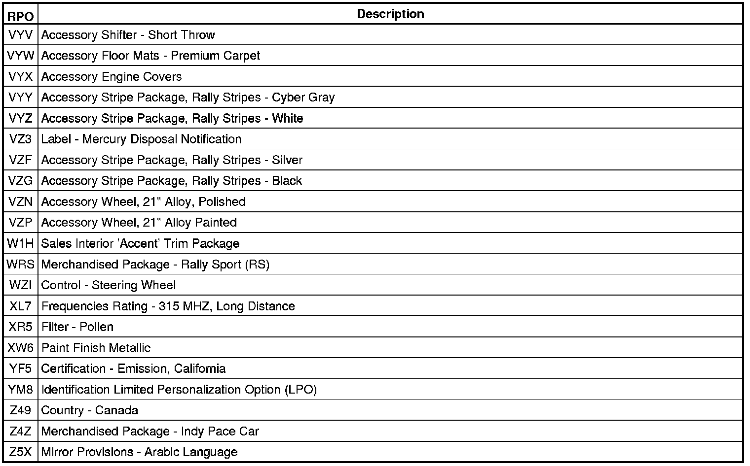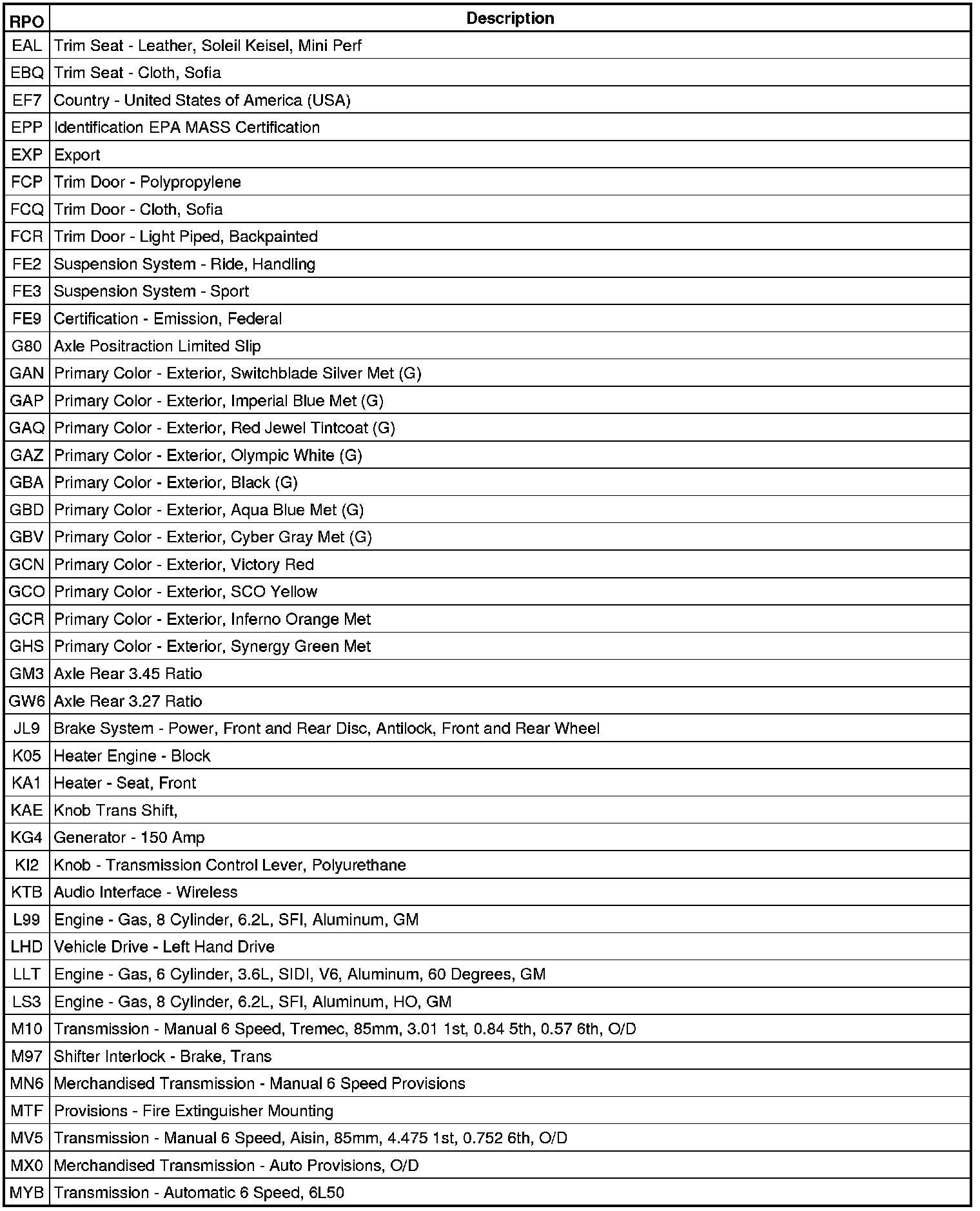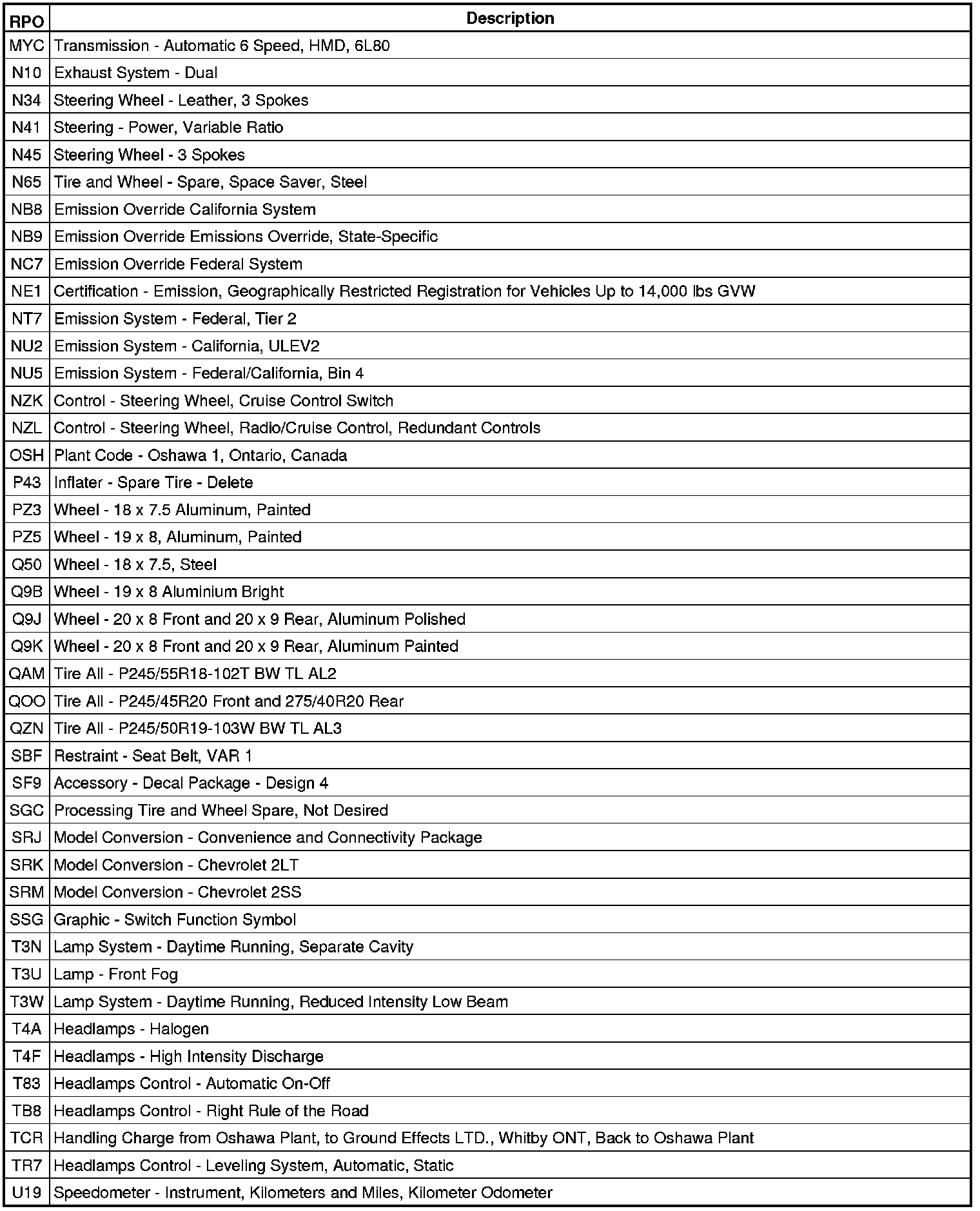 The following table provides the description of the RPO codes that are available on the vehicle. The vehicles RPO list is printed on the Service Parts Identification Label.
