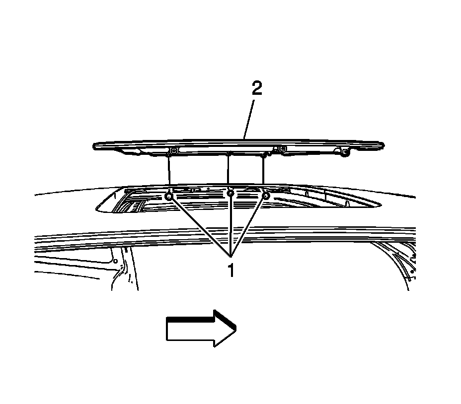 3. Install the sunroof window screws (1) to each side of the window (2). Do not tighten the screws.