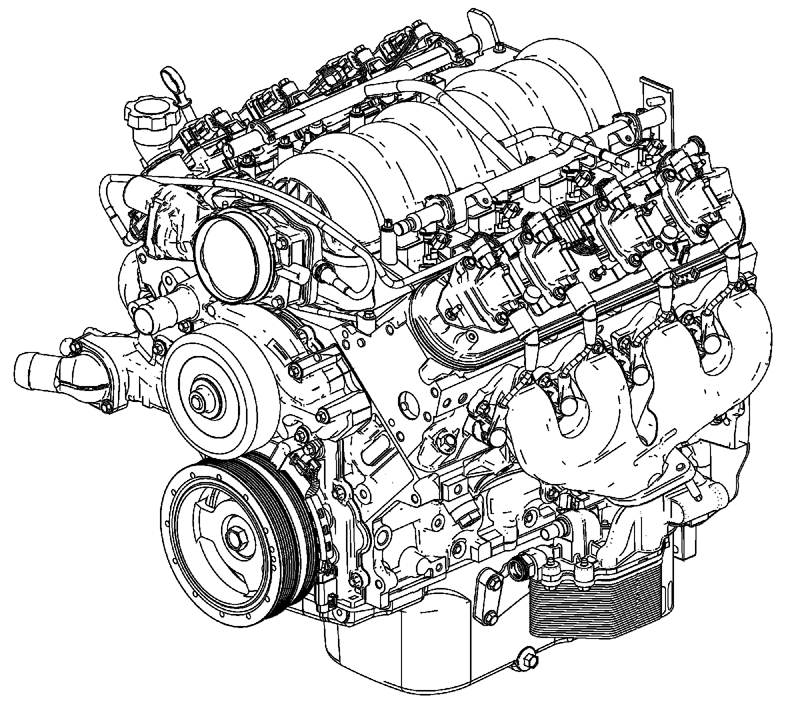 The structural rear-sump oil pan is cast aluminum. Incorporated into the design are the oil filter mounting boss, drain plug opening, baffle, oil level sensor, oil pressure relief valve, and oil level indicator tube opening. The oil filter bypass valve is now internal to the oil filter. An external engine oil cooler assembly is mounted directly to the left side of the oil pan. The alignment of the structural oil pan to the rear of the engine block and transmission housing is critical.