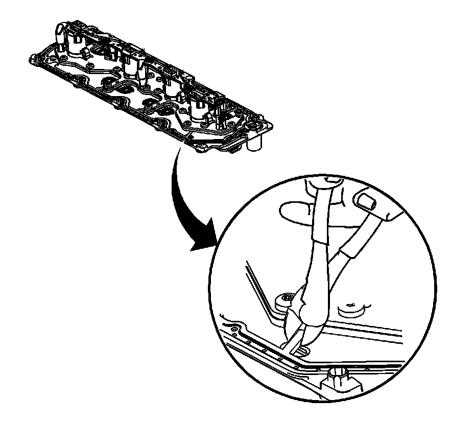 Important: Remove only the outer gasket from the manifold. Do not disassemble any of the internal components of the manifold in an attempt to remove the 8 inner sealing gaskets. If the inner gaskets are cut or damaged, replace the manifold as an assembly. Only use a wire-cutter type tool in order to minimize the amount of debris. Do not use a rotary-type cutting tool on the retaining straps.