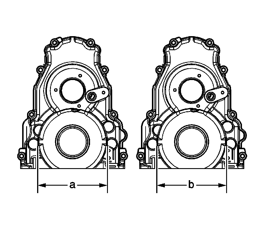 The engine front cover may have either a 141 mm (5.55 in) dimension (a) or 159 mm (6.26 in) dimension (b) alignment tab distance. Front cover alignment tool EN-48853 - tool is designed to properly align both design front covers. For the 141 mm (5.55 in) cover, adapters EN 48853-2 must be used.