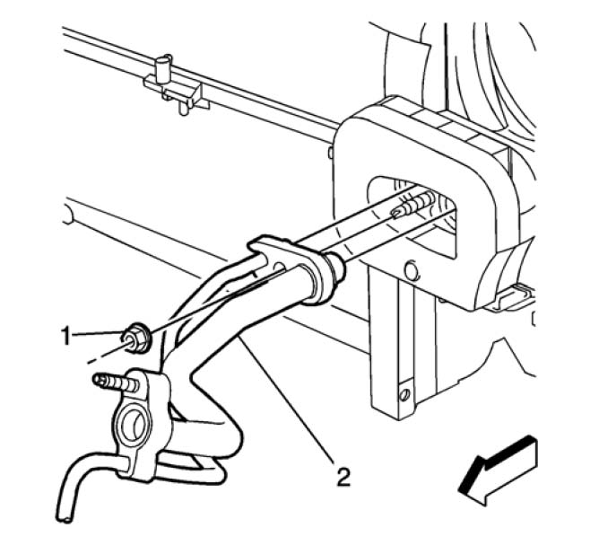 18. Remove the heater inlet rear and outlet hose (2) from the heater core.
