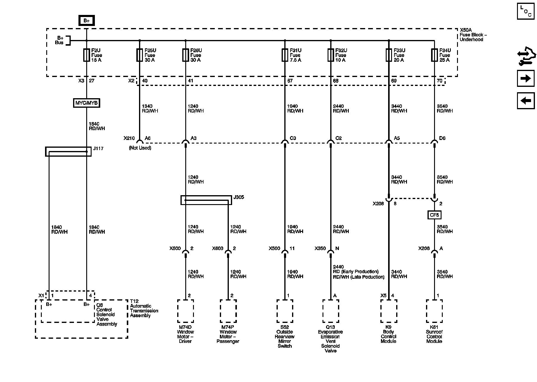 - Underhood - TCM BATT Fuse 2, POWER WINDOW REAR Fuse 25, POWER WINDOW FRONT Fuse 26, MIR EWL FR Fuse 31, CANNISTER VENT Fuse 32, BCM_6 Fuse 33, and SUNROOF Fuse 34