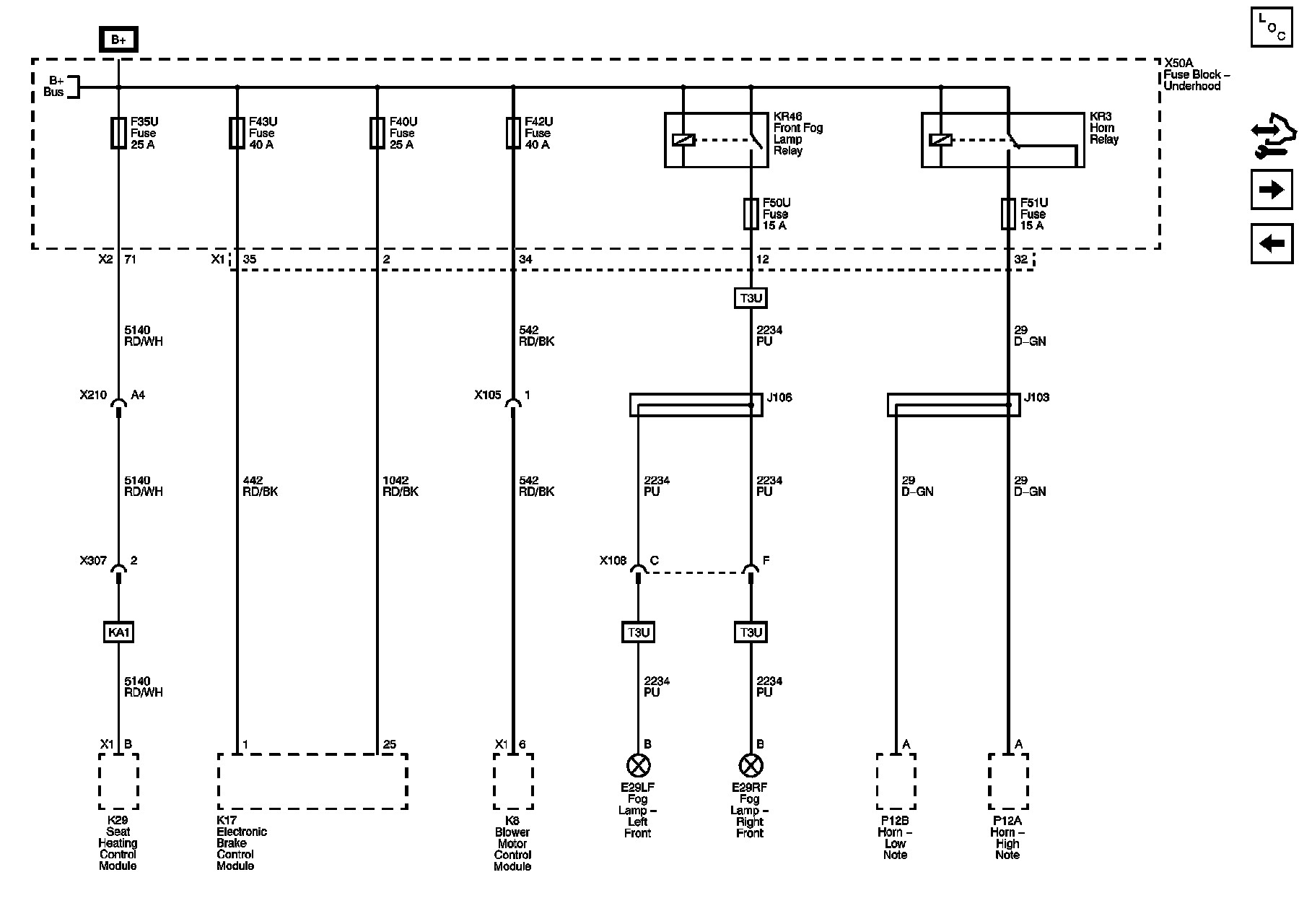 - Underhood - SEAT HEAT FRT Fuse 35, ABS PUMP Fuse 43, ABS VALVE Fuse 40, HTD_WASH Fuse 42, FRONT FOG LAMP Fuse 50, and HORN Fuse 51
