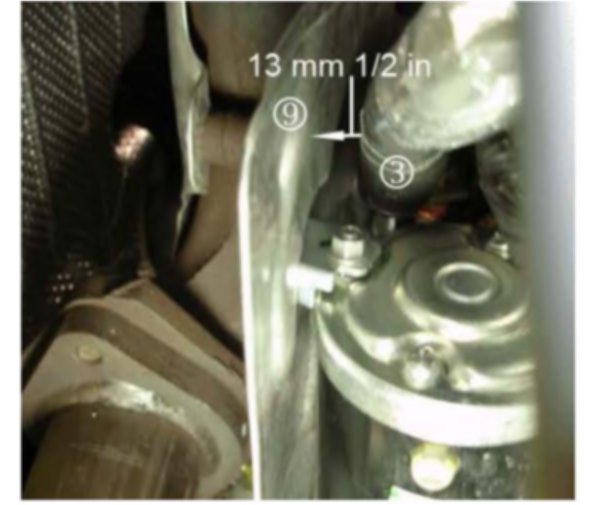 15. Ensure there is 13 mm (1/2 in) clearance between the battery positive starter cable (3) and the heat shield (9).