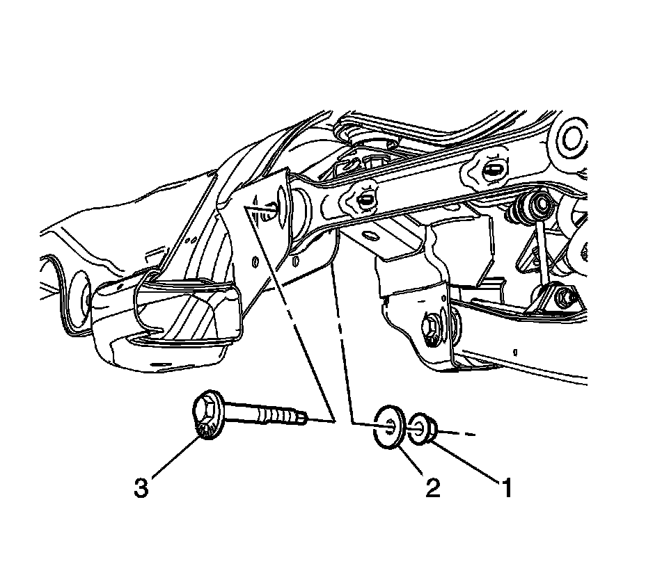 5. Remove the rear suspension adjuster link bolt (3), nut (1) and the washer (2).