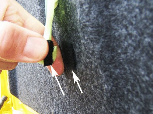 2. Install a 25 mm x 25 mm (1.0 in X 1.0 in) piece of hook and loop material, such as 3M(TM) Scotchmate Hook and Loop Fastening System*, P/N051131-06480, or the equivalent, to the ETR handle as shown. This will prevent the ETR handle from moving out of position when not in use.