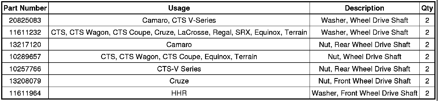 For Cruze, Equinox and Terrain, DO NOT reuse wheel drive shaft nut. Discard and replace with a NEW nut only.