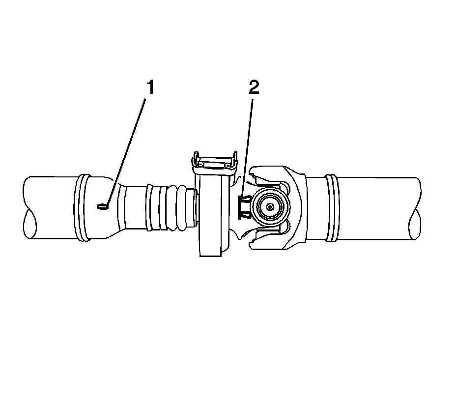 3. Mark the in the notch (1) in the front propeller shaft with the V (2) on the slip yoke.