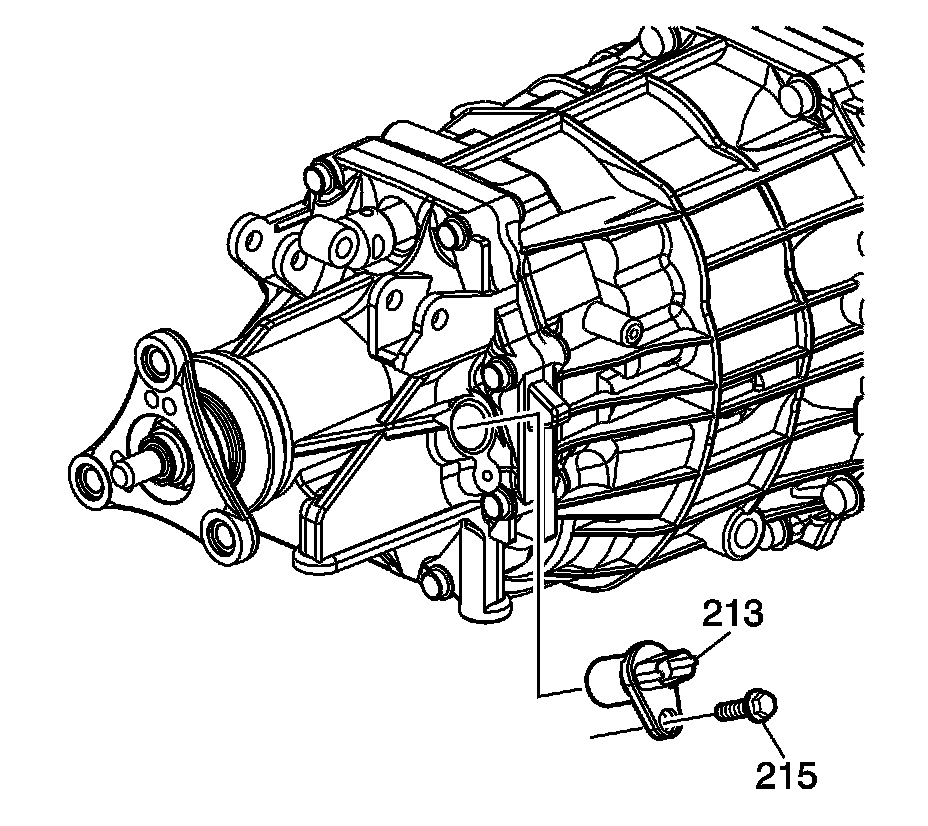 7. Remove the output sensor (213) and bolt (215) from the rear extension housing.