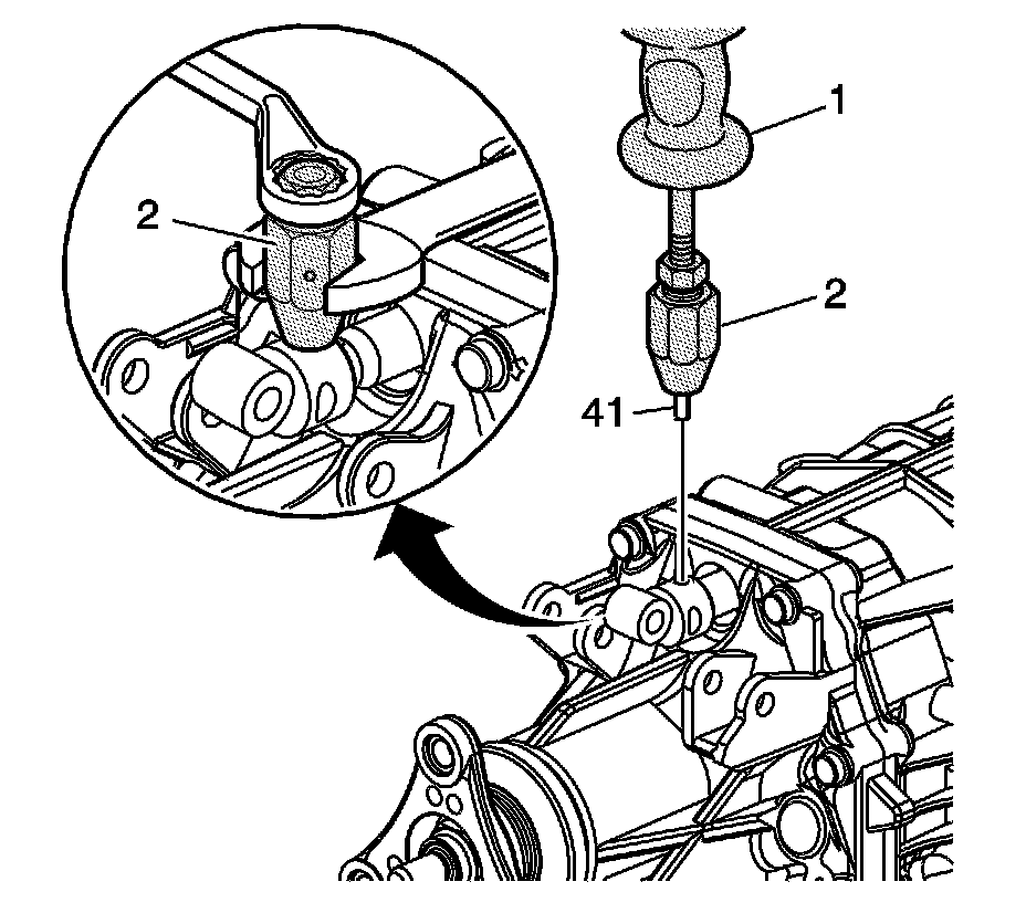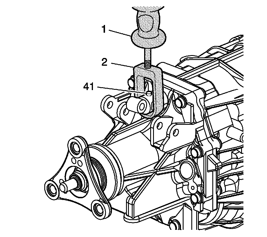11. Install J 6125-1B - slide hammer (1) onto DT-49027-2 - coil pin remover (2). Repeatedly, pull up on the slide hammer handle until the shift lever pin (41) is removed from the shift lever rod universal joint.