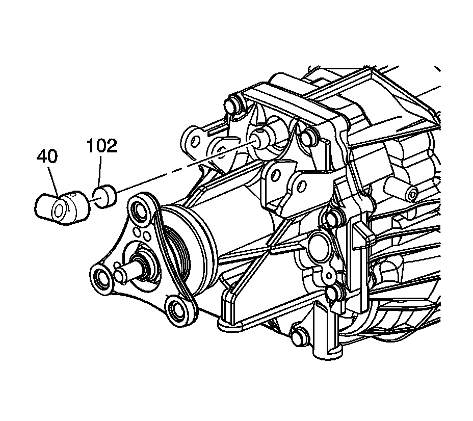 12. Remove the shift lever rod universal joint (40) and dampener (102) from the end of the shift control shaft.