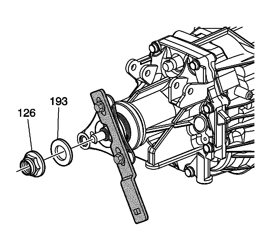 14. Install J 45012 - fixture to the propshaft flange (108) to remove the propshaft flange nut (126) and propshaft flange fluid seal (193).