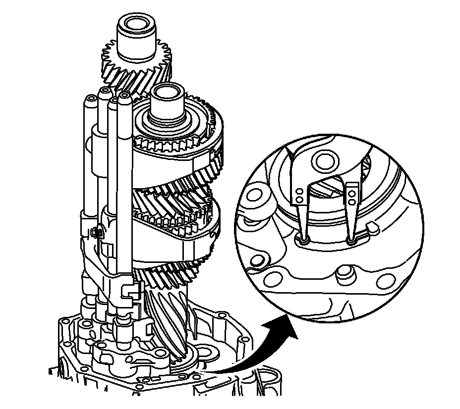 37. Expand and hold the snap ring on the front countershaft bearing.