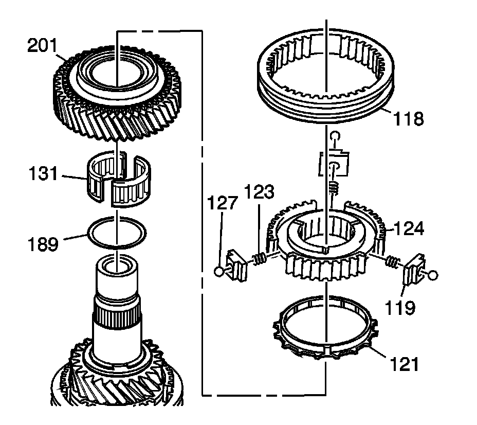 17. Apply lubricant and install the 5th/6th gear synchronizer hub (124) including the spring (123), detent ball (127) and insert (119).