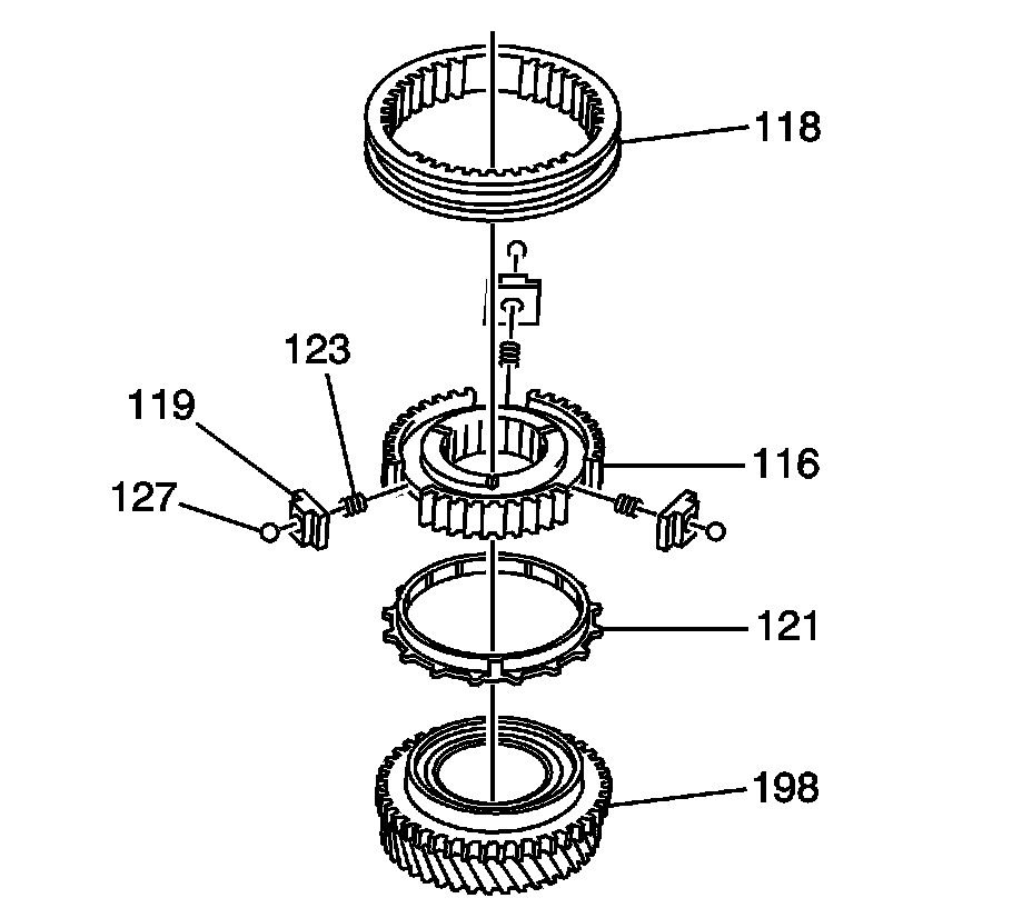 * The 3rd/4th gear synchronizer hub (116) including insert (119), detent ball (127) and spring (123)