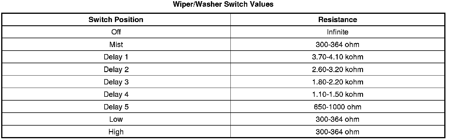 If any switch position is not within the specified range, replace the S80 Window Wiper/Washer Switch.