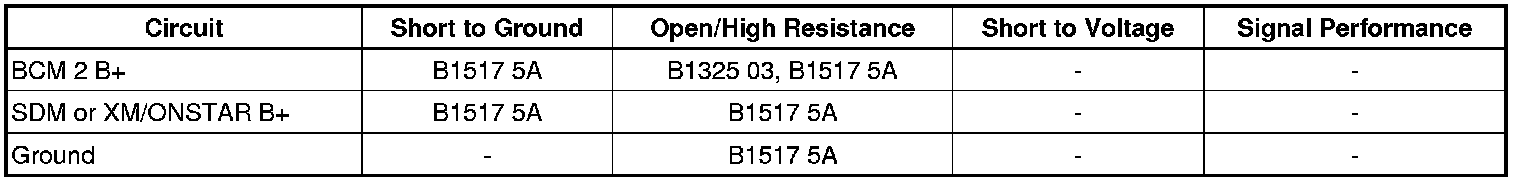 The body control module (BCM) has designated B+ circuits for monitoring vehicle system voltage, fed by the BCM 2 fuse and the SDM or XM/ONSTAR fuse. Fuse 24 in the BCM will either be labeled SDM or XM/ONSTAR, depending on vehicle content. The BCM monitors the system voltage to ensure that the voltage stays within the proper range. Damage to components and incorrect data may occur when the voltage is out of range. The BCM monitors the system voltage over an extended length of time. If the BCM detects the system voltage is outside an expected range for the calibrated length of time, or the BCM battery sense circuits differ by 3 volts, DTC B1517 5A will set. Other modules also monitor system voltage. The system voltage message is sent to the other modules and will default to 12.9 volts if DTC B1517 5A sets.