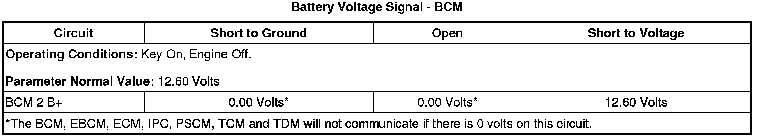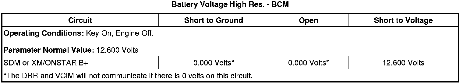 2. Observe the scan tool BCM Battery Voltage Signal parameter and the Batt. Voltage High Res. parameter. The reading for both parameters should be between 12.6 and 15.0 volts, and should be within 2 volts of each other.