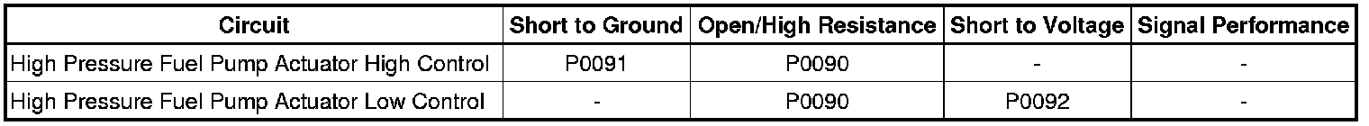 * The high pressure fuel pump actuator voltage is less than 2.7 V with the actuator commanded OFF.