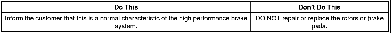 Under certain weather or operating conditions, occasional brake squeal, squeak, or other noise may be heard with the above vehicle's performance braking system. The brake system is designed for superior fade resistance and consistent operation using high performance brake pads. Some brake noise and brake dust is considered normal and do not affect system performance.