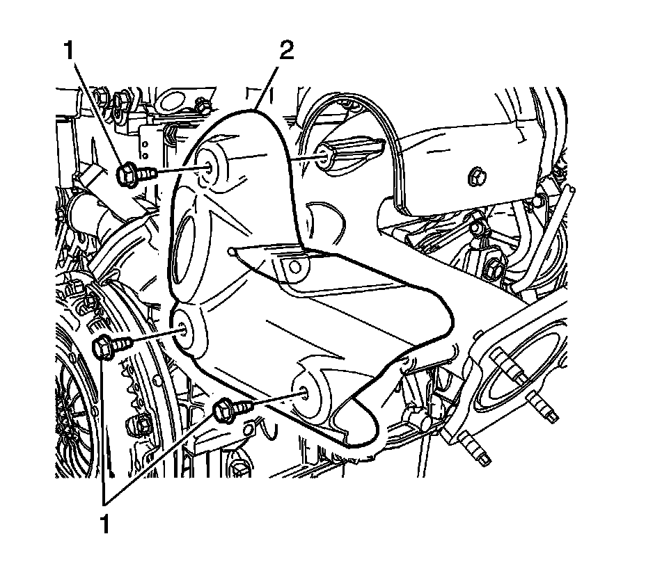 6. Install the turbo heat shield (2) and the turbo heat shield bolts (1) and tighten to 9 Nm (80 lb in).