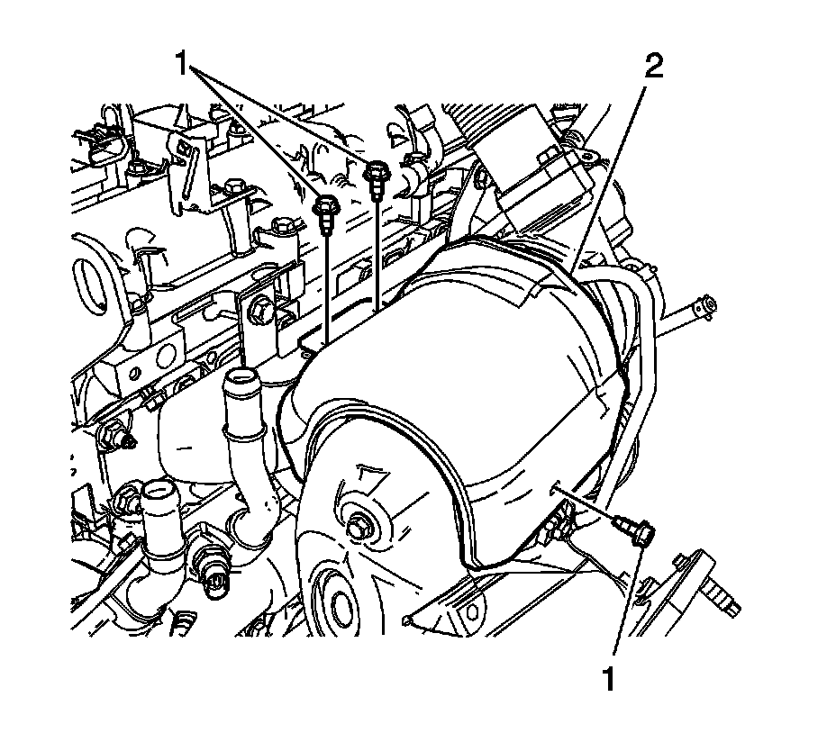10. Remove the turbo heat shield bolts (1) and the turbo heat shield (2).
